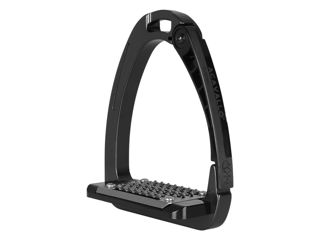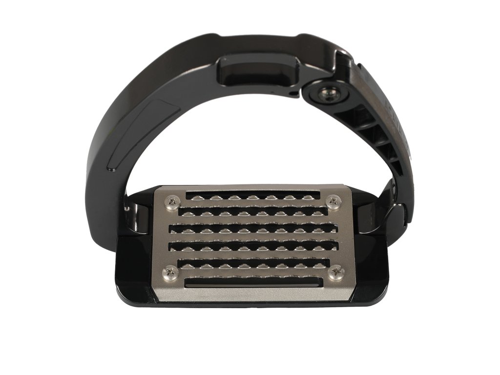 Bezpečnostní kovové třmeny pro dospělé Acavallo s širokou nášlapnou plochou v tmavě šedé barvě.