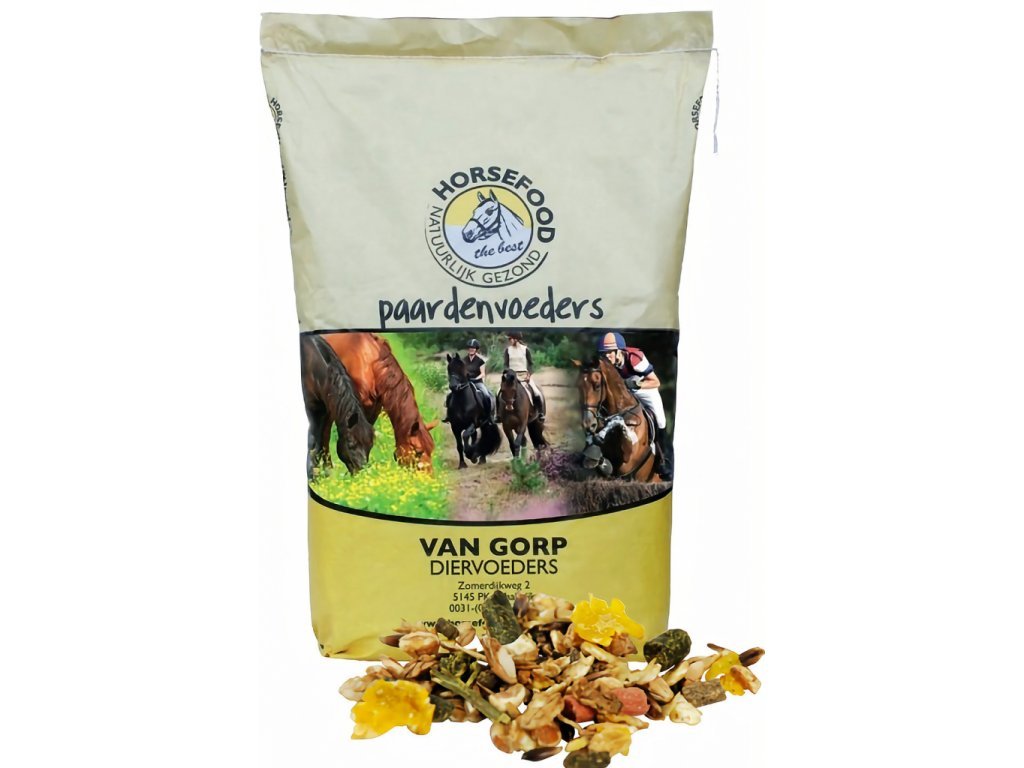 Ječné vločky, drcený oves, granulovaná vojtěška, kukuřičné vločky, pelety jemných otrub, sojový extrahovaný šrot, rozložené ovesné vločky, špalda, pufovaná pšenice, vitamínová zrnka, melasa, vojtěška s dlouhými vlákny, pufovaná kukuřice, sojový olej, lněný olej, kvasnicová kultura.