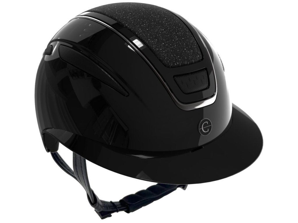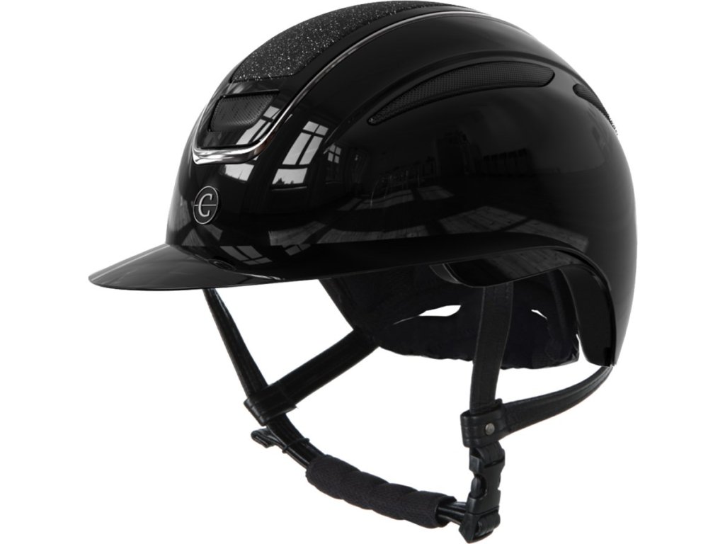 Elegantní jezdecká přilba Covalliero Elite Polo Gloss s kamínky a lesklým povrchem v černé barvě.