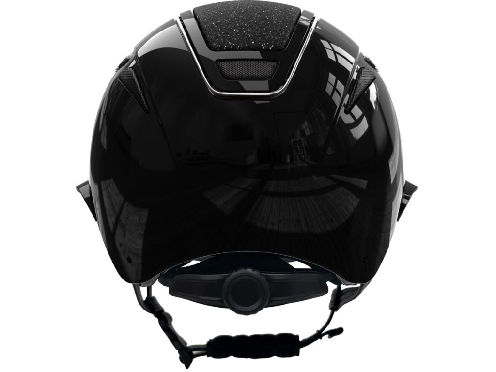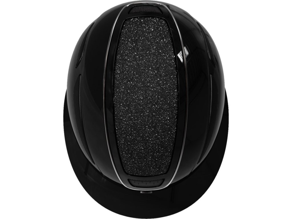Jezdecká helma na koně v černé barvě s lesklou skořepinou a kamínkovým prostředním panelem.