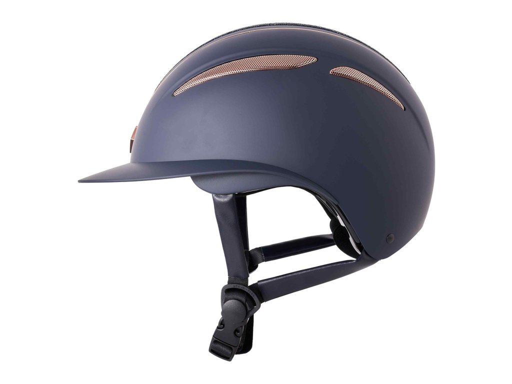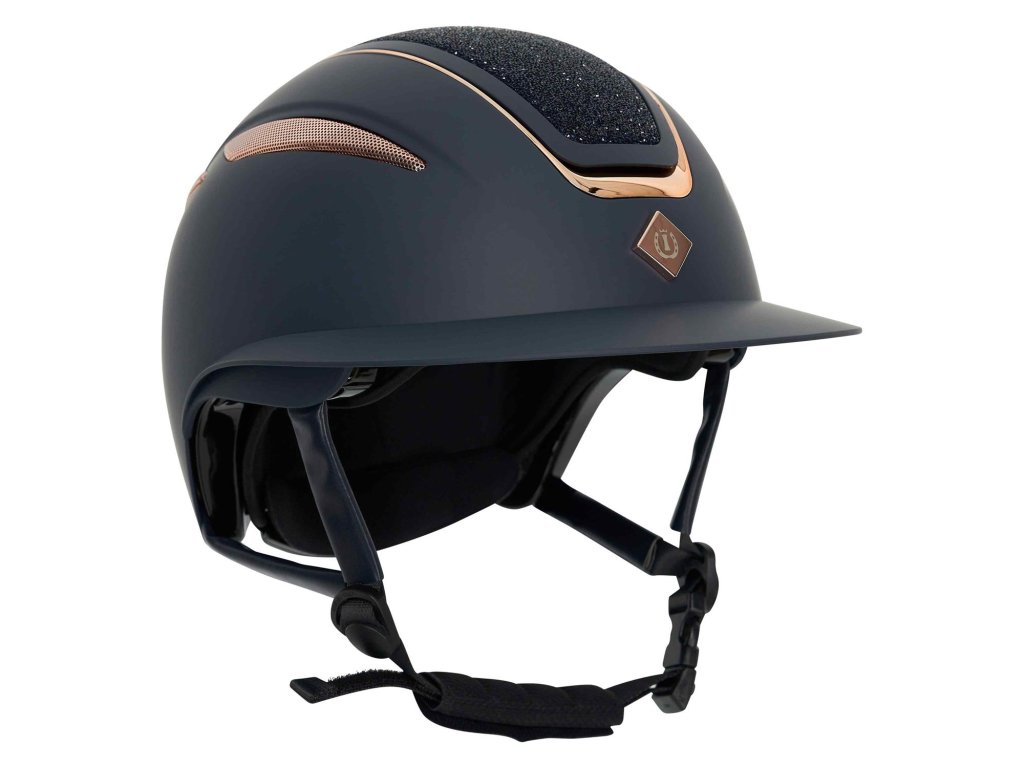 Jezdecká přilba Imperial Riding v modré barvě s glitry a rosegold doplňky.